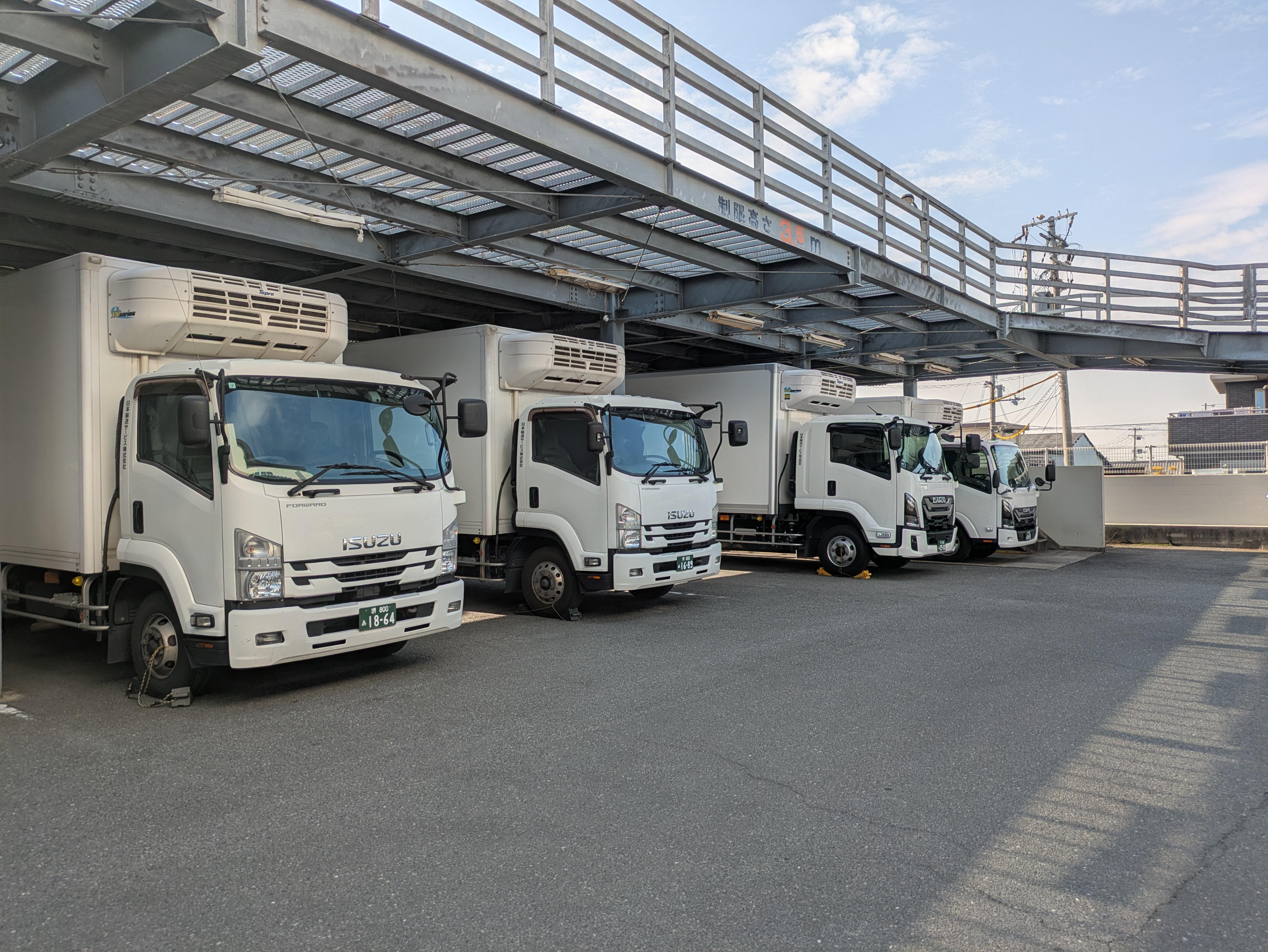 | 保有車種・台数 | 10t大型冷凍車10台 8t冷凍車1台 5t冷凍車1台 4t冷凍車パワーゲート付8台 4t冷凍車8台 3t冷凍車9台 計37台 |